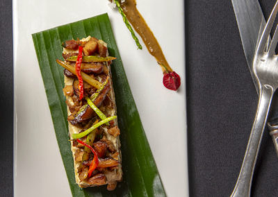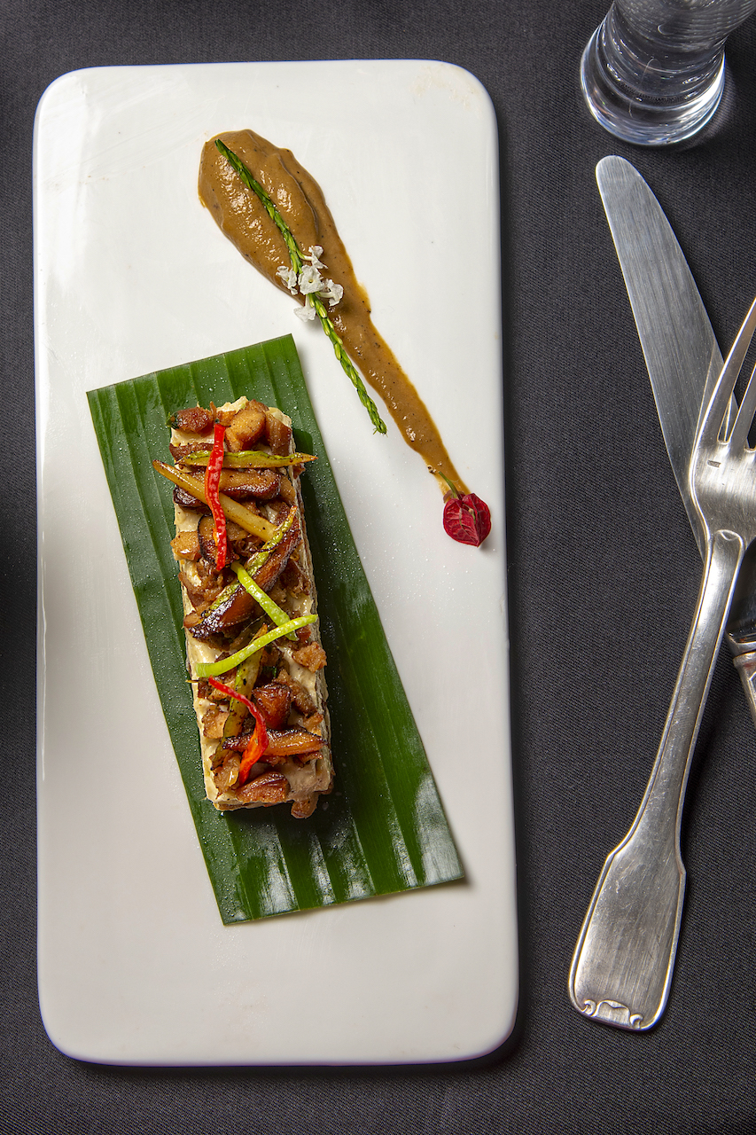Photo 3 + légende : Millefeuille de lambi au fruit à pain (biscuit de peau de fruit à pain, soufflé de fruit à pain, lambi concassé, soufflé de fruit à pain, biscuit, soufflé, lambi).